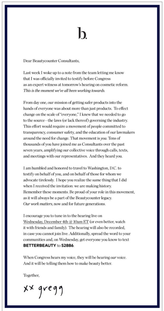 This morning as I was checking my email, I was blown away to receive the above note from our Beautycounter CEO and Founder, Gregg Renfrew, who was invited to testify live in front of Congress tomorrow (?!).