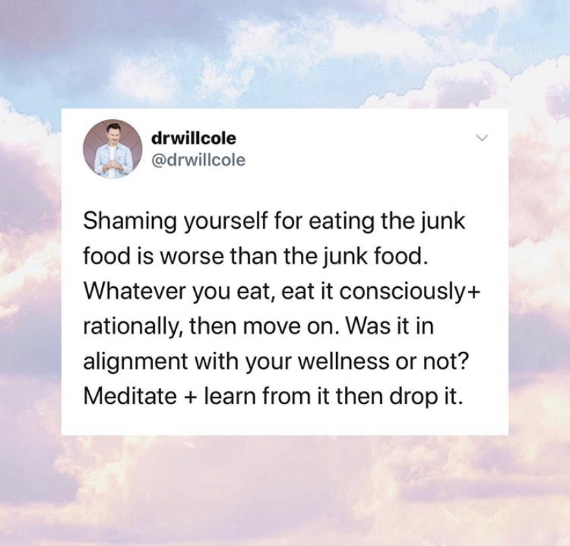 This is definitely not the time to strive for perfection, as those highs are highs and lows can be very low, and sometimes that junk food is exactly what you needed at that exact time. Instead, keep focusing on your health and wellness but when you stray from your usual eating habits and enjoy some junk food, acknowledge that it’s okay!