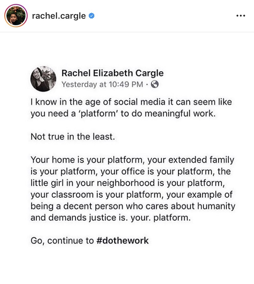 As the world continues to turn upside, seeing these amazing words from Rachel Cargle really spoke to me. As much as I love this growing Living Cleaner, Easier & Safer community and while I will continue to share what moves me, Rachel’s post reiterated how your actions really do and should transcend beyond any social media platforms.