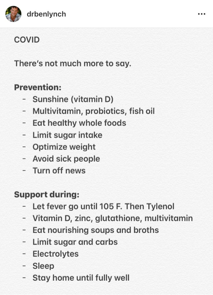 Dr. Lynch’s recommended advice should you come down with Covid is wonderful too to have in your back pocket just in case (again consult with your own Doc should you get sick), but these supporting tips can certainly apply during cold/flu season as well.