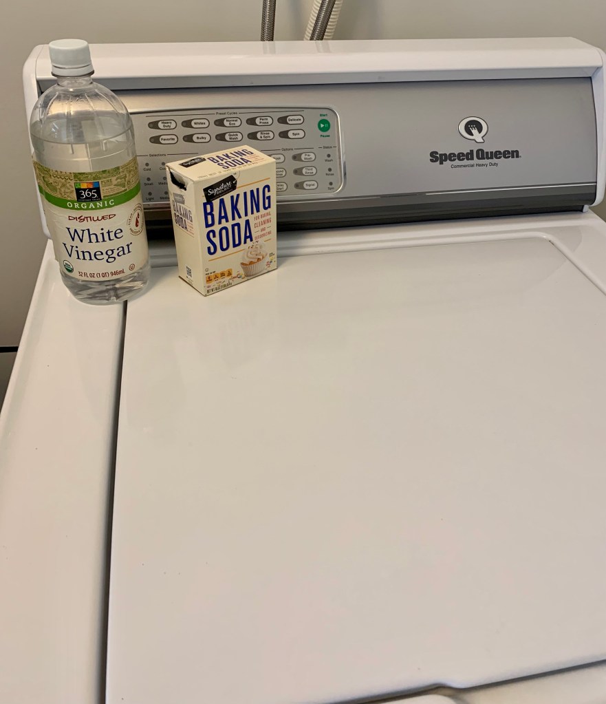 For my top loader, I set it to the largest, hottest setting and added four cups of vinegar and one cup of baking soda once it filled up with water.