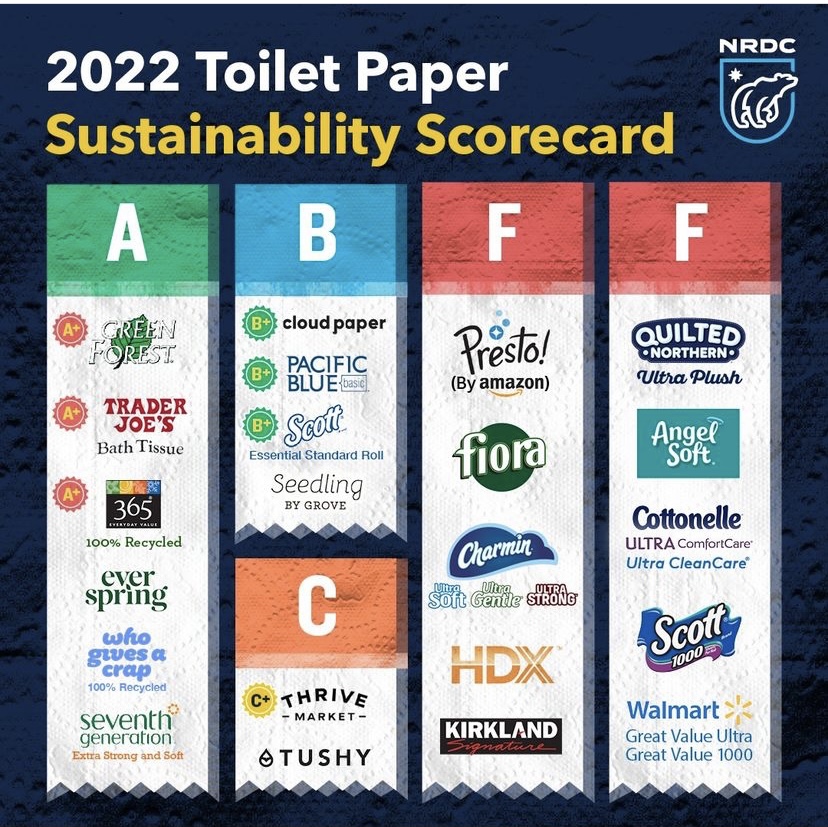 Seeing NRDC’s recent sustainability report about toilet paper was reassuring, as my go-to brand got an A – woohoo!!