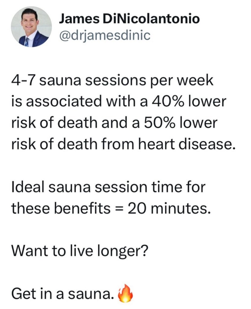 According to Dr. James DiNicolantonio, regular sauna sessions lowers your risk of death and heart disease and provides many more health benefits like detoxification, reduced stress, decreased inflammation, improved sleep, muscle recovery and increased circulation (to name a few).