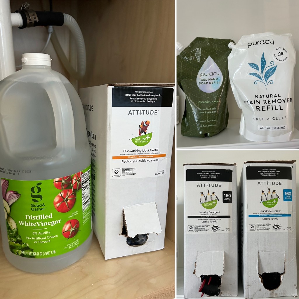 For our family, we buy white vinegar, laundry detergent, hand soap, dish soap and stain remover (#affiliate) in bulk/refills, to name a few.