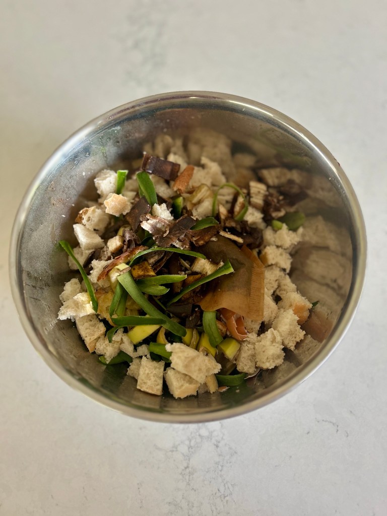 Next, you’ll want to designate a large bowl that you can use throughout the day for your food waste and then add to the composter at the end of each day. I chose a stainless steel bowl (it’s about the size of the biggest one from this set) and be sure to ventilate the lid, so air can escape and your scraps don’t start to stink!