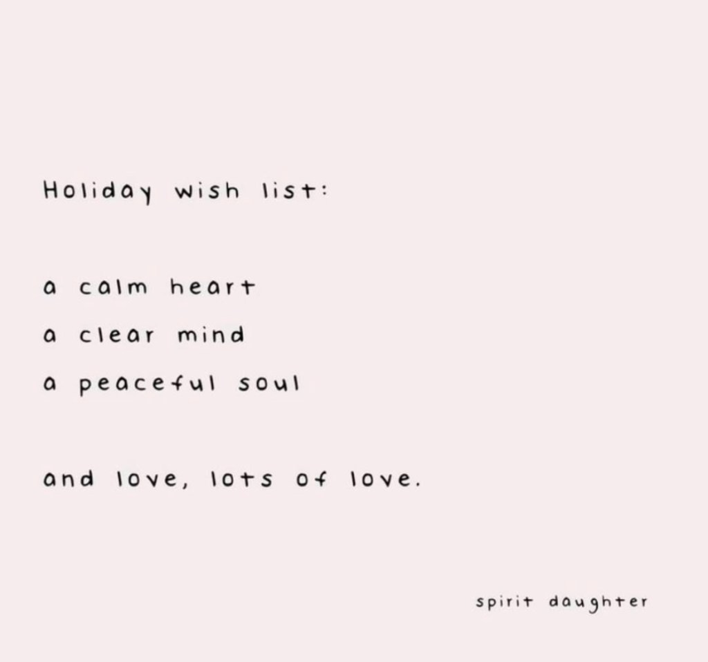 Whichever holiday you may celebrate, we are in the homestretch, so let’s re-center and get back to the basics! Here’s to prioritizing what we all deserve (and hope to be receiving!) this year and it’s the perfect time to share this holiday wish list for everyone (thank you, @spiritdaughter for your many words of wisdom):
