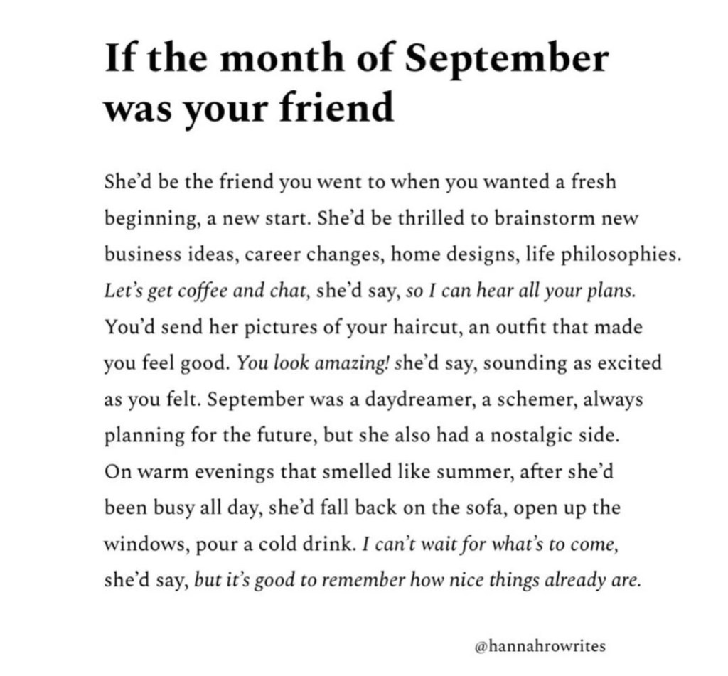 While I know it’s always hard to say goodbye to August and once Labor Day is over, the end of summer blues can be tough – but how amazing is it to re-imagine September as a friend and all the amazing things he or she would tell or teach us?
