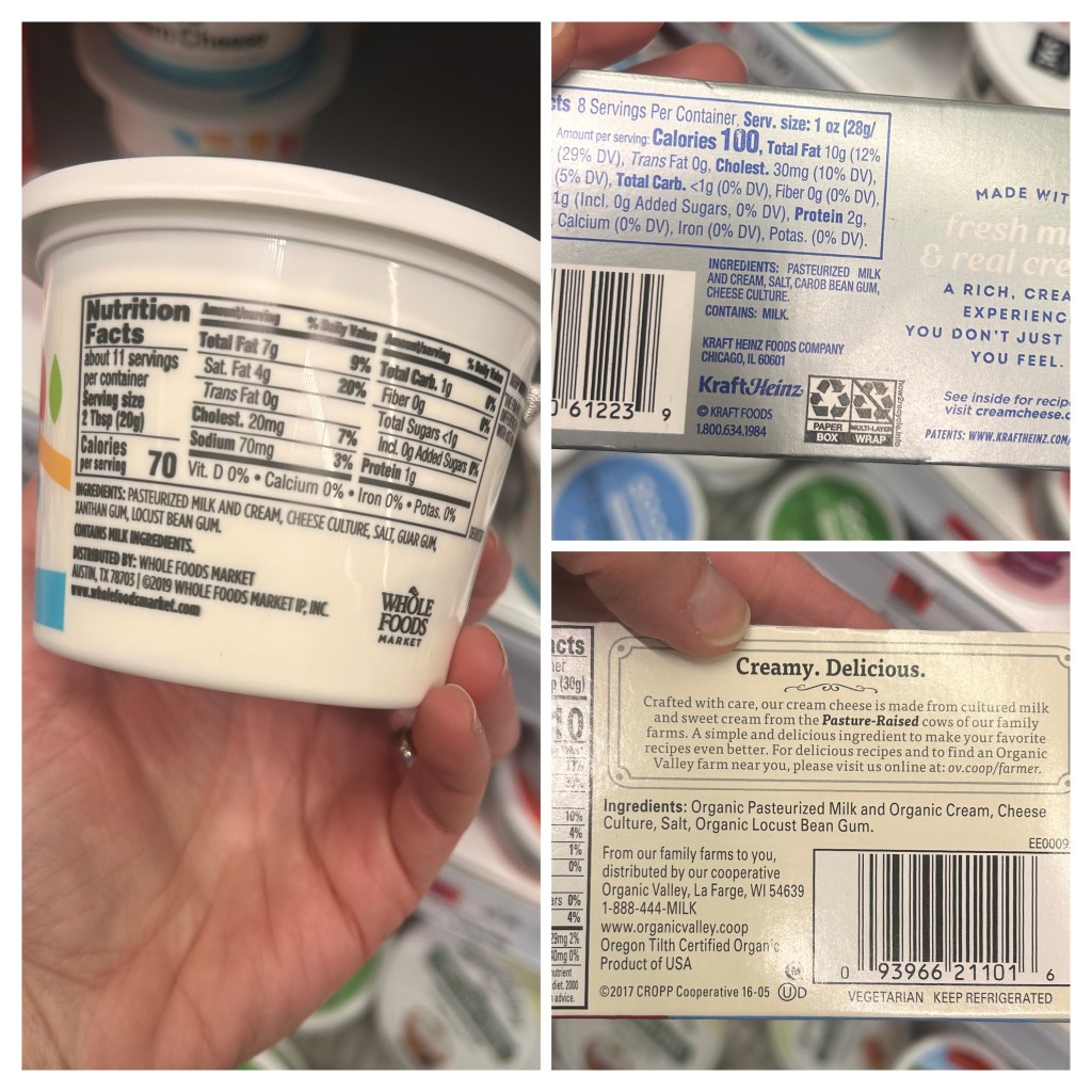 If you’re like me and my family, we tend to go in waves regarding favorite foods we buy and eat regularly. While cream cheese hasn’t always been at the top of our list, it now is and only recently did I decide to check out the ingredient labels of some of our go-to brands – and I was surprised after not reading the labels for some time!
